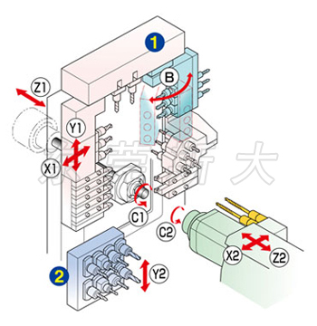 | 四、斯大走心機(jī)SR-20RIVtypeB了進(jìn)一步實(shí)現(xiàn)多樣化復(fù)合加工,充實(shí)了背面?zhèn)鹊墓δ,從而在背面刀架臺(tái)配備8軸鉆孔單元,并搭載Y2軸控制作為標(biāo)配,在刀架臺(tái)上備有可通過(guò)操作系統(tǒng)控制的角度可變化的B軸動(dòng)力單元,使得刀具可在工件外圓和端面上任意角度加工傾斜表面。 | |||